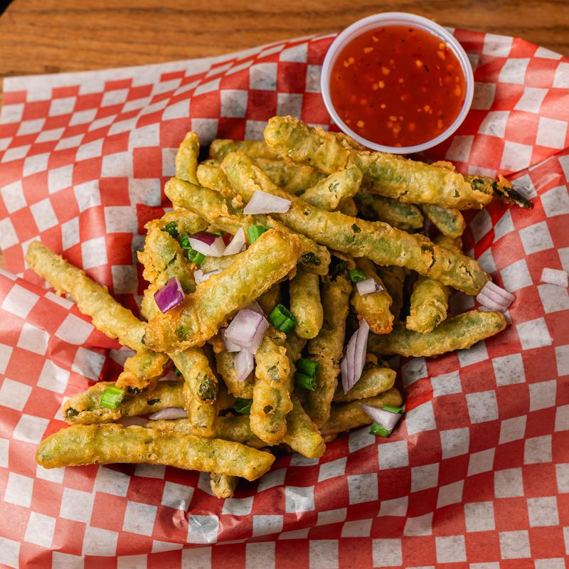 Deep fried tempura green beans with a side of sweet chilli sauce
