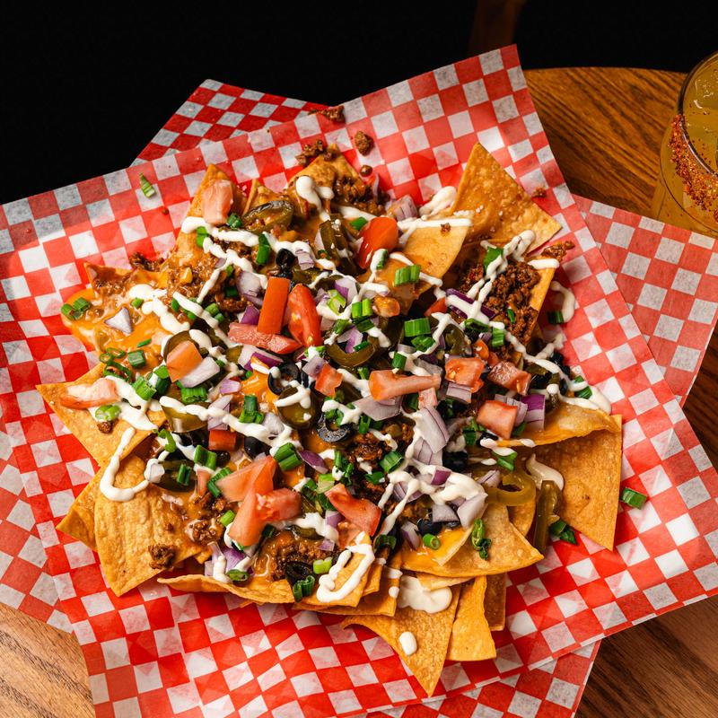 Hand fried corn tortilla chips topped with queso, tomatoes, red onion, jalapenos, sour cream, ground round & goddamn olives!