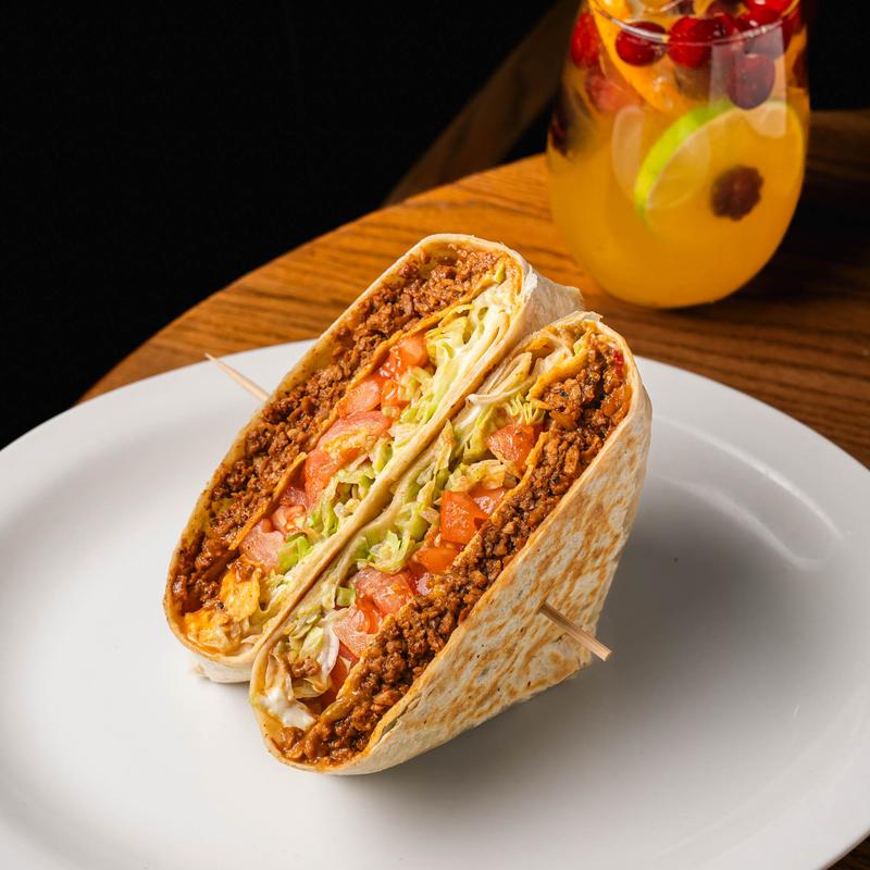 Seasoned ground round, queso cheese, lettuce, tomato, sour cream & a tostada, wrapped in a grilled tortilla