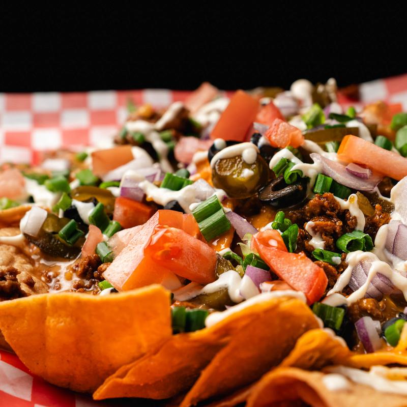 Hand-cut fries, covered in seasoned ground round, queso, tomato, sour cream, & green onion