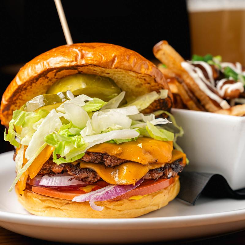 2oz Beyond Meat smash patty on a brioche bun topped with tomatoes, onion, lettuce, mayo, ketchup, mustard & melted cheddar cheez | *Add an extra smash patty for $2.50